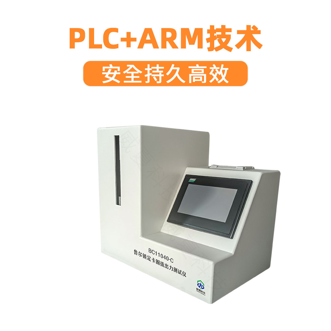 由可编程控制器,触摸屏,力值传感器,传动装置,机载打印机等组成,提供中英文菜单显示,具备人机对话设定各项参数自动运行测试模式。另增设生产单位,生产批次机打输入,使测试结果更加规范化标准化。信息安全方面采用三级密码,让信息安全可靠。针对测试结果自动判断,不合格则启动自动蜂鸣报警,并由打印机打印出测试数据及结果以供分析。在测试过程中显示鲁尔锁定卡圈拔出力的曲线、力值、可测试鲁尔锁定卡圈拔出力的性能,并在测试过程中显示装配施加的力值、曲线等参数。