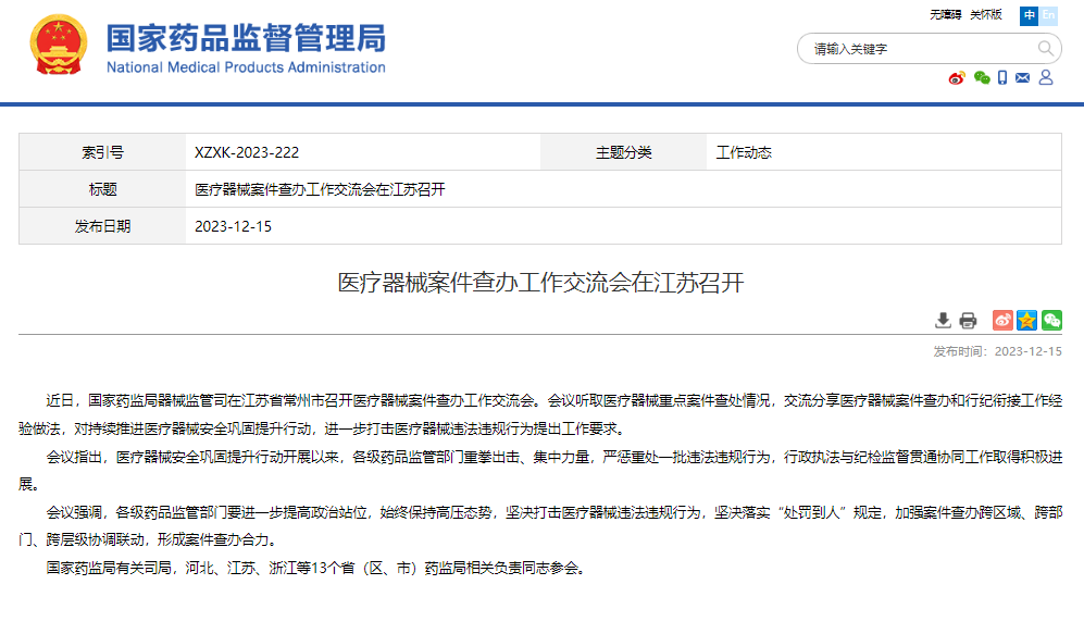 近日,国家药监局器械监管司在江苏省常州市召开医疗器械案件查办工作交流会。